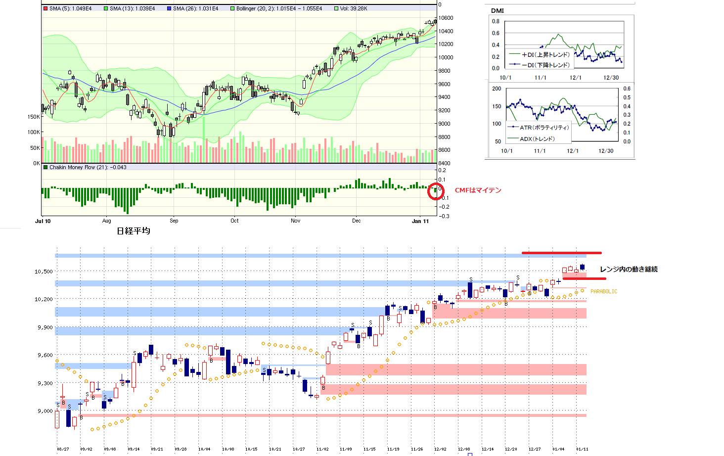 2011/01/12 - 月とスッポンさんの株式ブログ。タイトル:「1/12 本日のチャート①」 本文:1.MP 2.先週のMP 3、CMF,DMI,窓