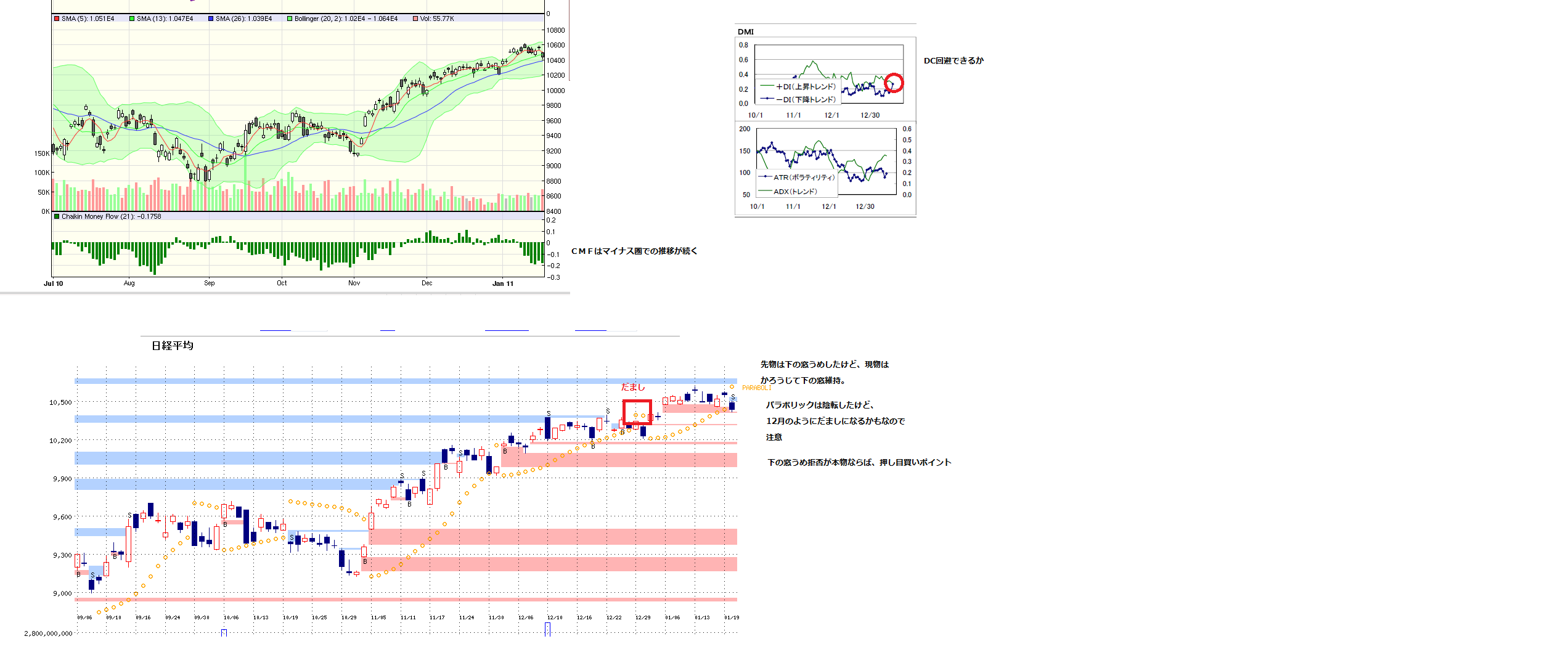 2011/01/20 - 月とスッポンさんの株式ブログ。タイトル:「1/20 本日のチャート①」 本文:1、MP 2、先週のMP 3、CMF,DMI,窓 ☆ ・NYの下落の割りにまた日経が売られる展開 ・NYは今週SQ,そのからみか? ・中国利上げも聞き飽きた材料