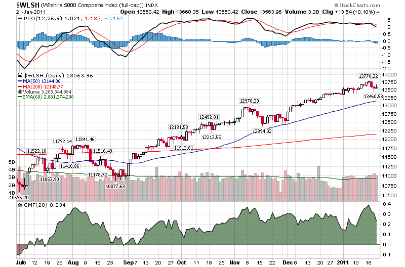 2011/01/22 - Newジェントルマンさんの株式ブログ。タイトル:「NY株 急落の恐れ」 本文:ウォーリッシュ5000を例に見る。 PPOはネガティブダイバージェンス CMFは急速に落ち始め NYは近い内に暴落する可能性が高い。