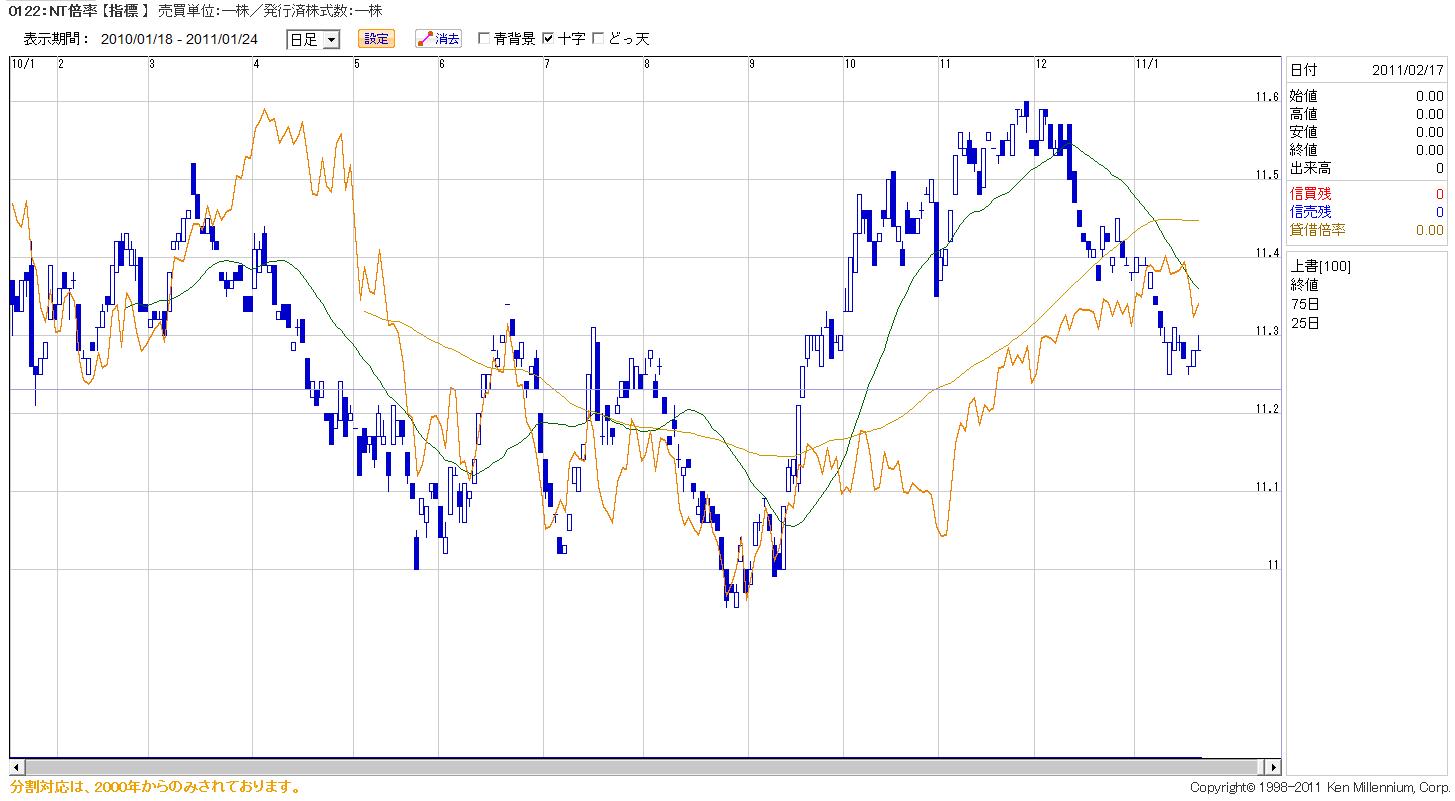 2011/01/24 - Newジェントルマンさんの株式ブログ。タイトル:「NT倍率は11月はじめを下回っている」 本文:TOPIXが買われていると言うより225構成銘柄が売られている証ではないか?