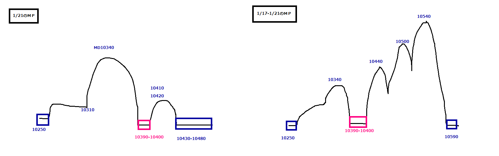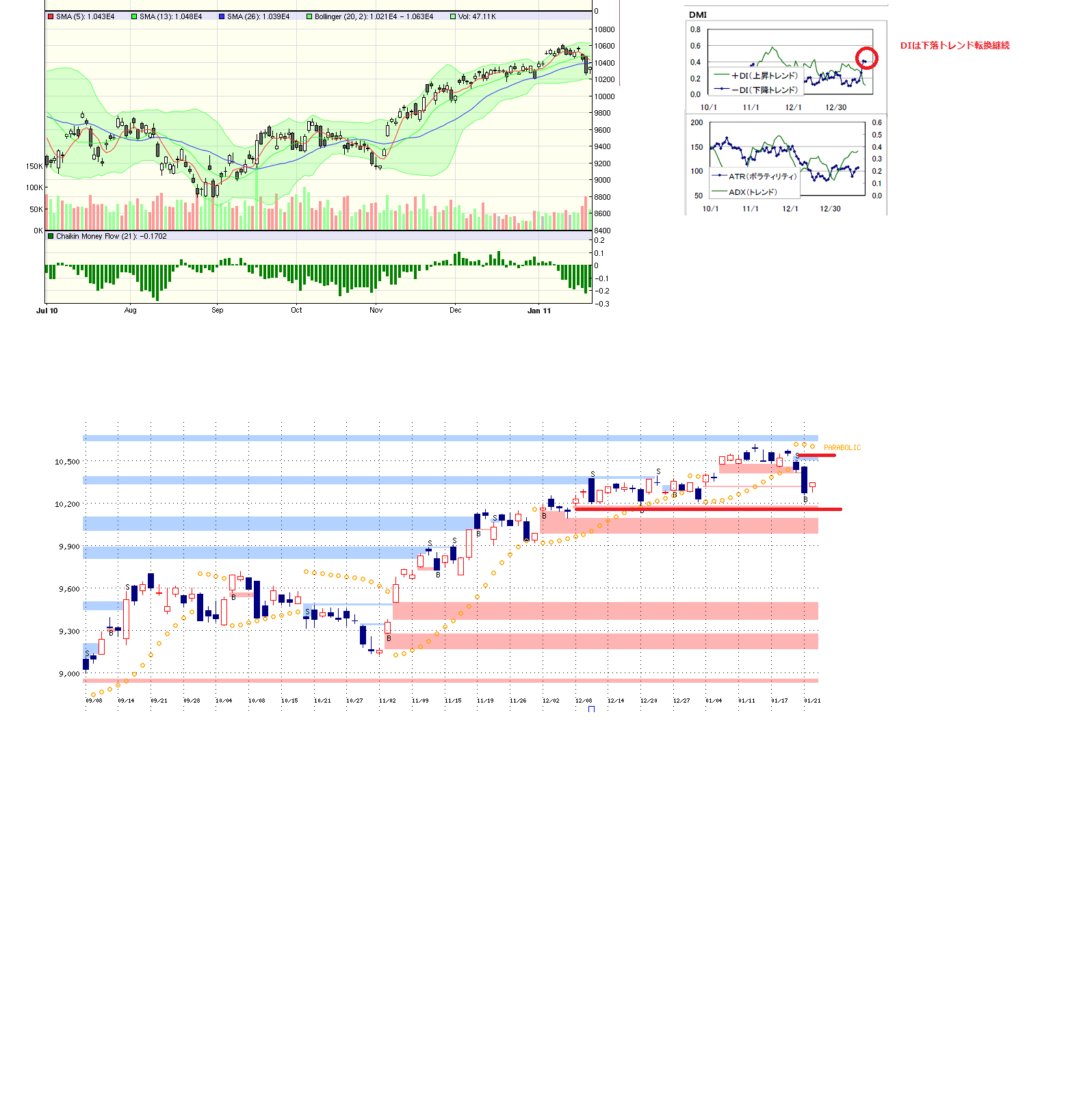 2011/01/24 - 月とスッポンさんの株式ブログ。タイトル:「1/24 本日のチャート①」 本文:1、MP 2、先週のMP 3、CMF、DMI,窓 ☆相場雑感 ・金曜売りのクレディが買い戻し。売り単価の10350円に近づき、一気に買いもどいてきたんだと思う。