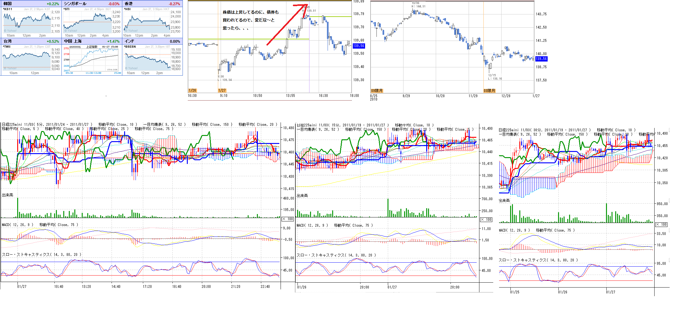 2011/01/27 - 月とスッポンさんの株式ブログ。タイトル:「1/27 本日のチャート②」 本文:1.分足と債券の記録 2.CMF,DMI,窓 ☆ニュース