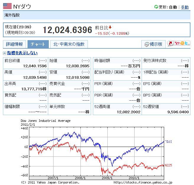 2011/02/02 - フォーナインさんの株式ブログ。タイトル:「NYダウがリーマンショック前の水準まで回復」 本文:5年前の日経平均が出来過ぎだったと仮定しても、米国市場と比べて、大底を打ってからの戻りがまだまだ弱いですね。 節分天井の格言は破れるかな...