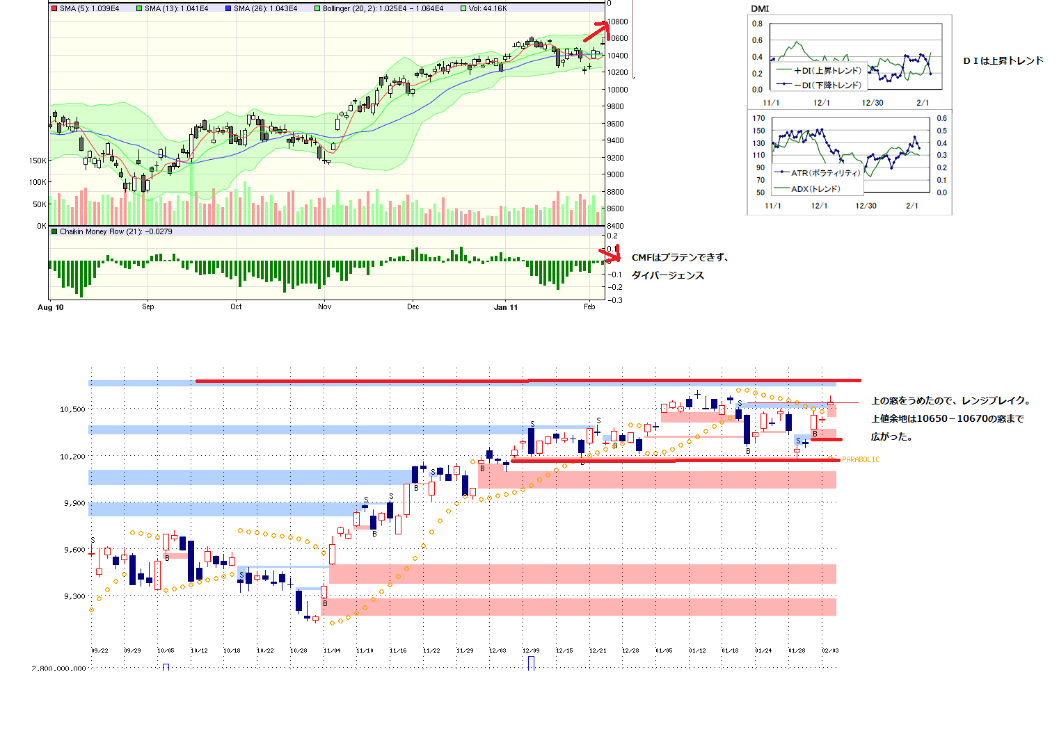 2011/02/04 - 月とスッポンさんの株式ブログ。タイトル:「2/4 本日のチャート①」 本文:1、MP 2.CMF,DMI,窓 ☆相場雑感 ・ダウ+20ドルでも日経100円超高? ・TOPIX高円更新 ・雇用統計発表前の↑がパターンになりつつありますね。