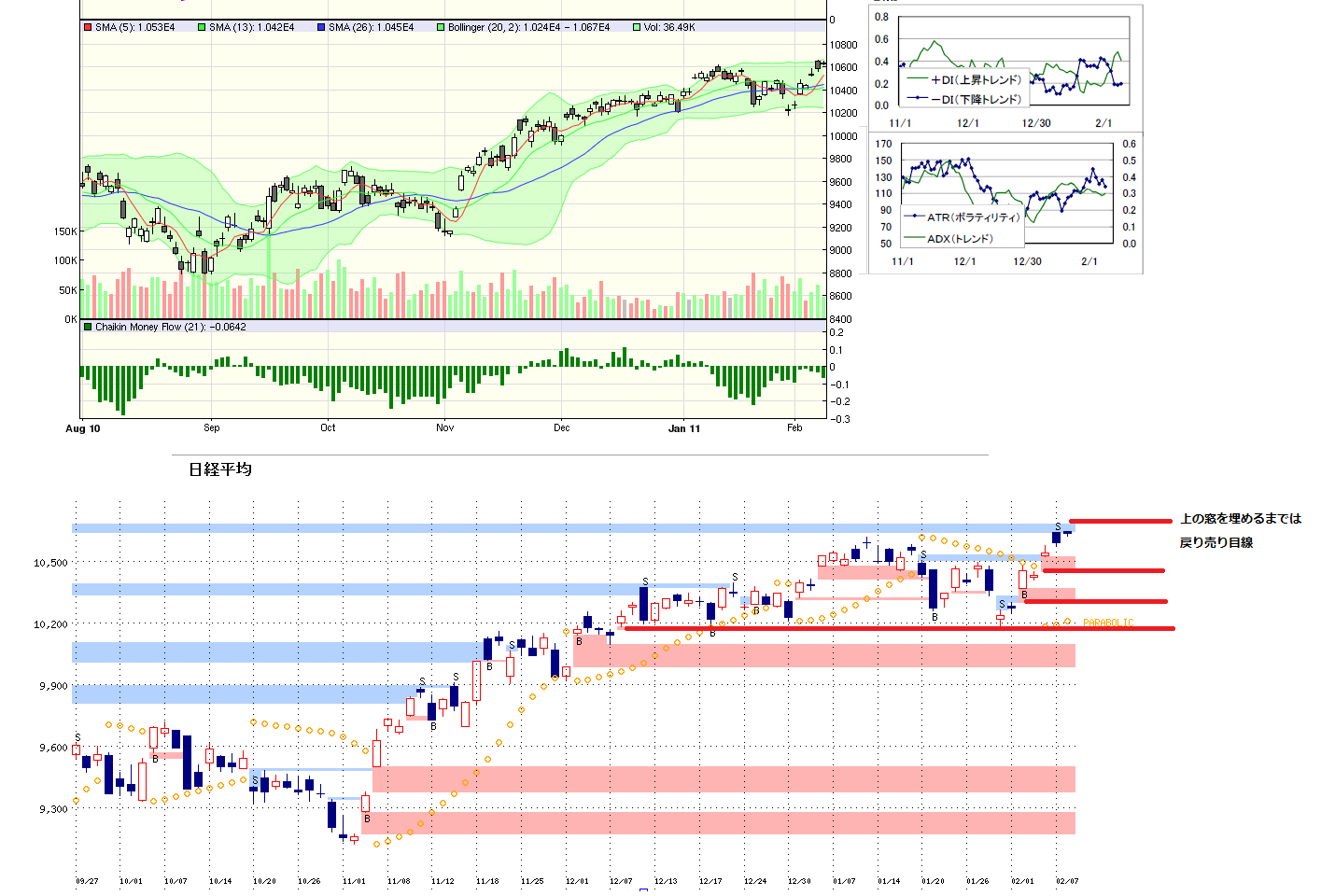 2011/02/08 - 月とスッポンさんの株式ブログ。タイトル:「2/8 本日のチャート①」 本文:1、MP 2、先週のMP 3、CMF,DMI,窓