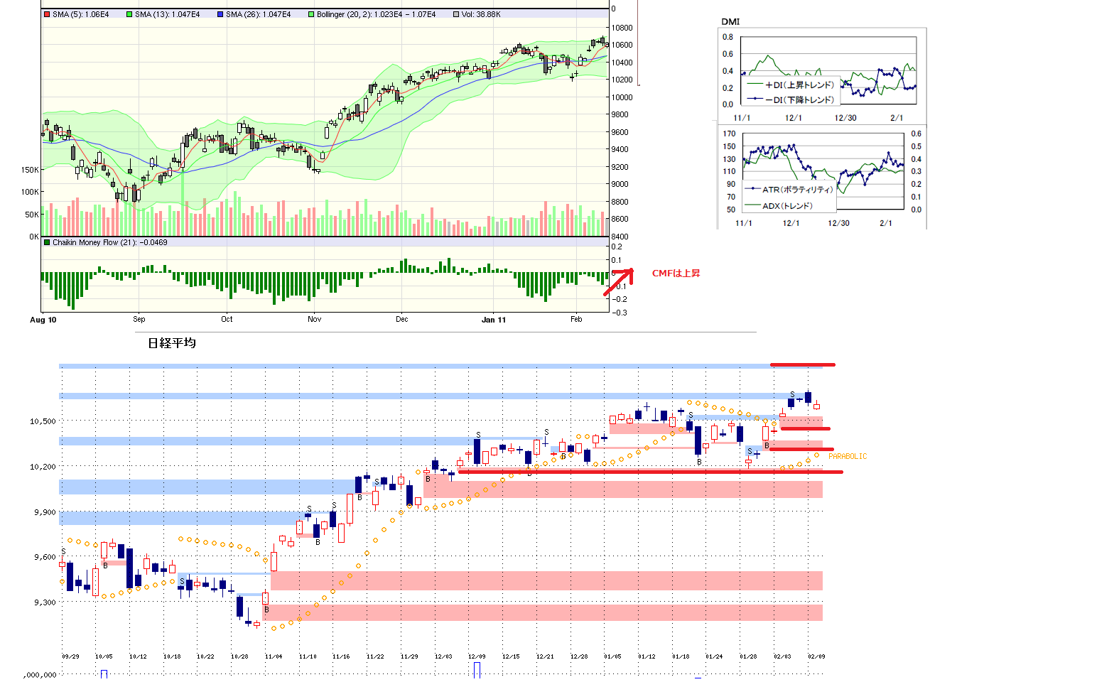 2011/02/10 - 月とスッポンさんの株式ブログ。タイトル:「2/10 本日のチャート①」 本文:1、MP 2、CMF,DMI,窓