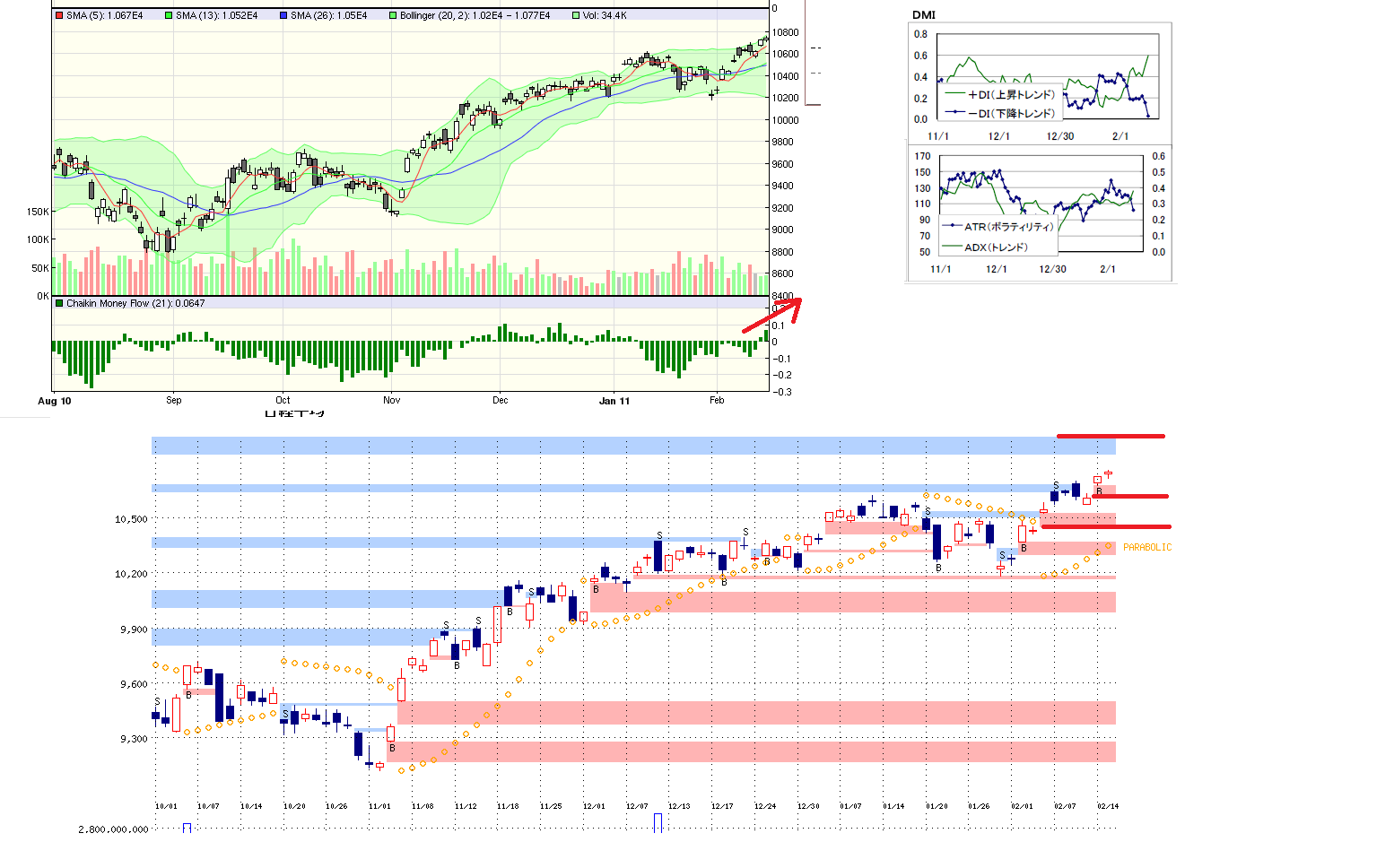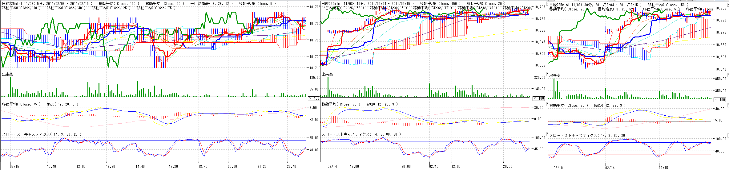 2011/02/15 - 月とスッポンさんの株式ブログ。タイトル:「2/15 本日のチャート簡易版」 本文:微熱が続いてますので、コメントは後日返信いたします、すみません>< 1、MP 2、CMF,DMI,窓 3、分足 ☆ニュース