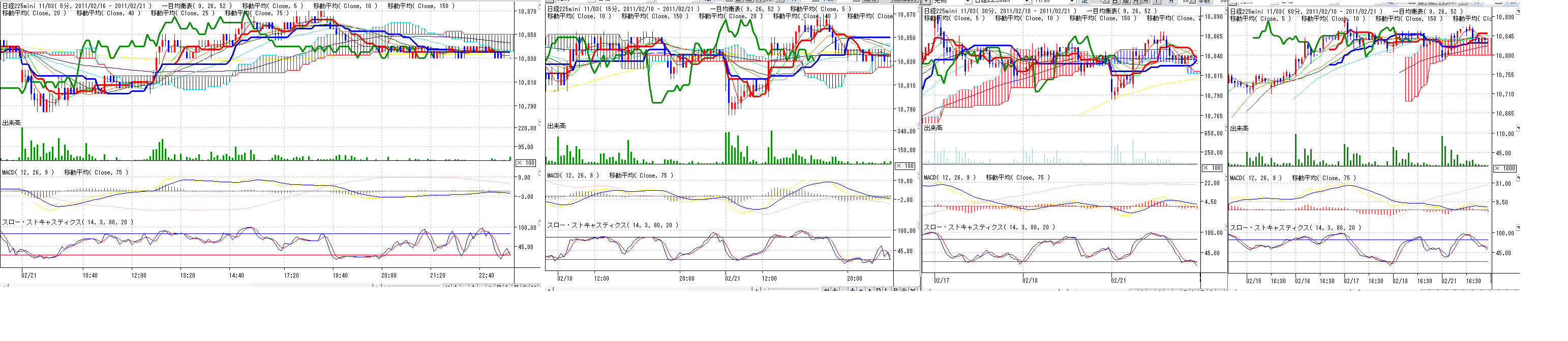 2011/02/21 - 月とスッポンさんの株式ブログ。タイトル:「2/21 本日のチャート②」 本文:画像 分足と債券の記録 (夕場終了後にアップします デイトレポイントとしては、金曜も今日も、ストキャに注目。 ☆ニュース