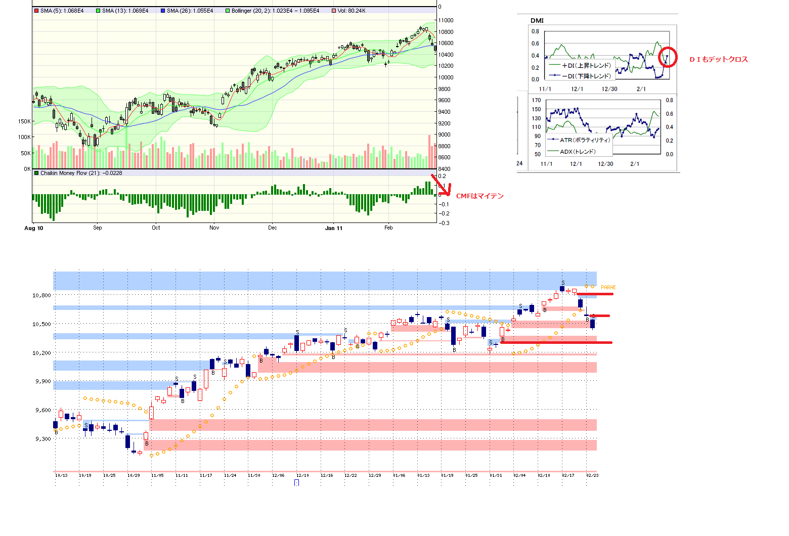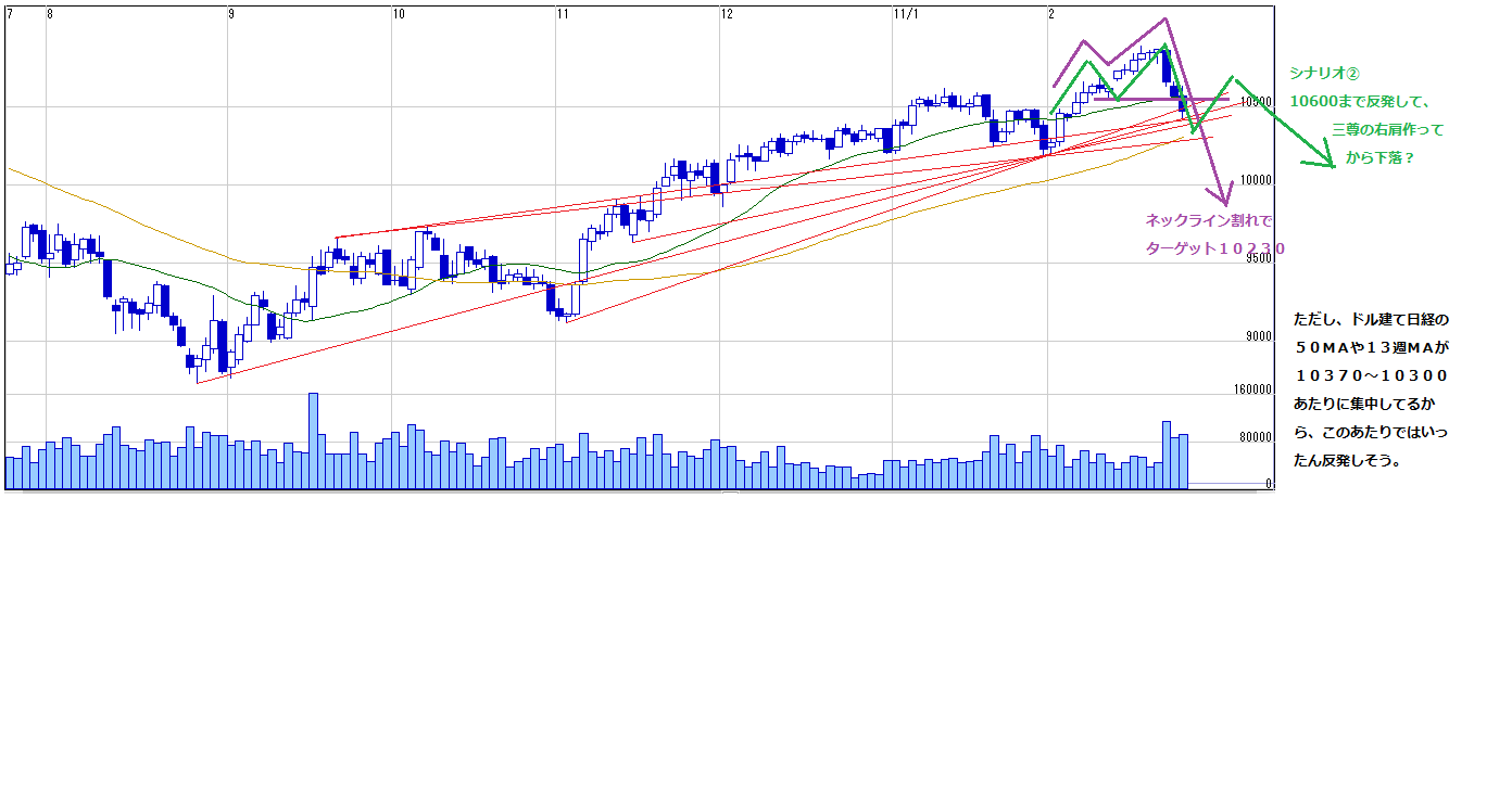 ・明日反発すれば、10600まで反発して、三尊の右肩作り?ともいえる。