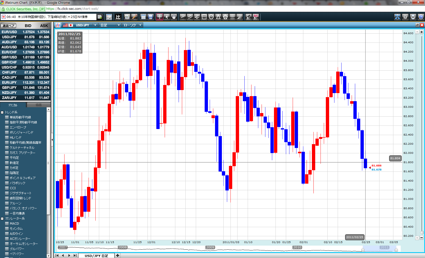 先週は月曜日は堅調、火曜日~木曜日がカダフィーショックとも言えるリビア問題で各国株価指数は大下げ、為替市場もUSD/JPYは4営業日続落とさえませんでした。