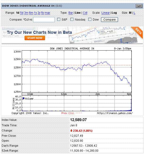 カントリーワイド・ファイナンシャルの破綻の噂や、AT&TのCEOが「消費者向け部門では事業の伸びがやや鈍化している」と述べたことから、景気減速懸念で大幅下落となりました。ナスダック総合指数は8営業日続落。金は高値更新。
