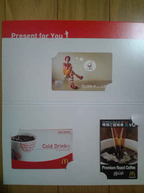 お土産は写真のとおり「マックカード」500円分と「コールドドリンクS」「プレミアムローストコーヒーS」の特別ご招待券(無料券)各10枚でした。
