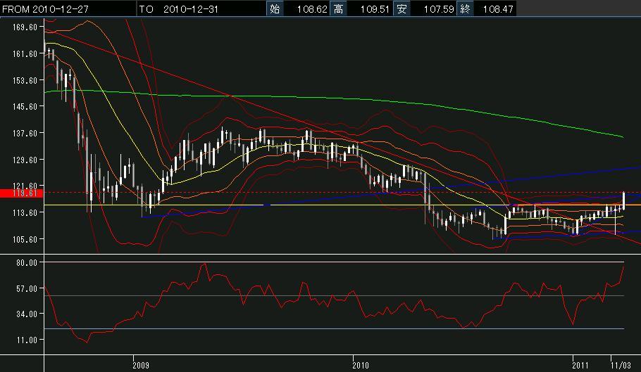 2010年9-10月の116円付近をネックラインにしたWボトムが完成。