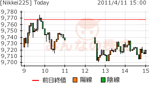 下げて始まった。放射能汚染、製造業業績悪化、為替円安一服。ポルトガルやリビアの情勢。原油・穀物高による物価上昇懸念。などで株価低迷企業によるものと思わせる。