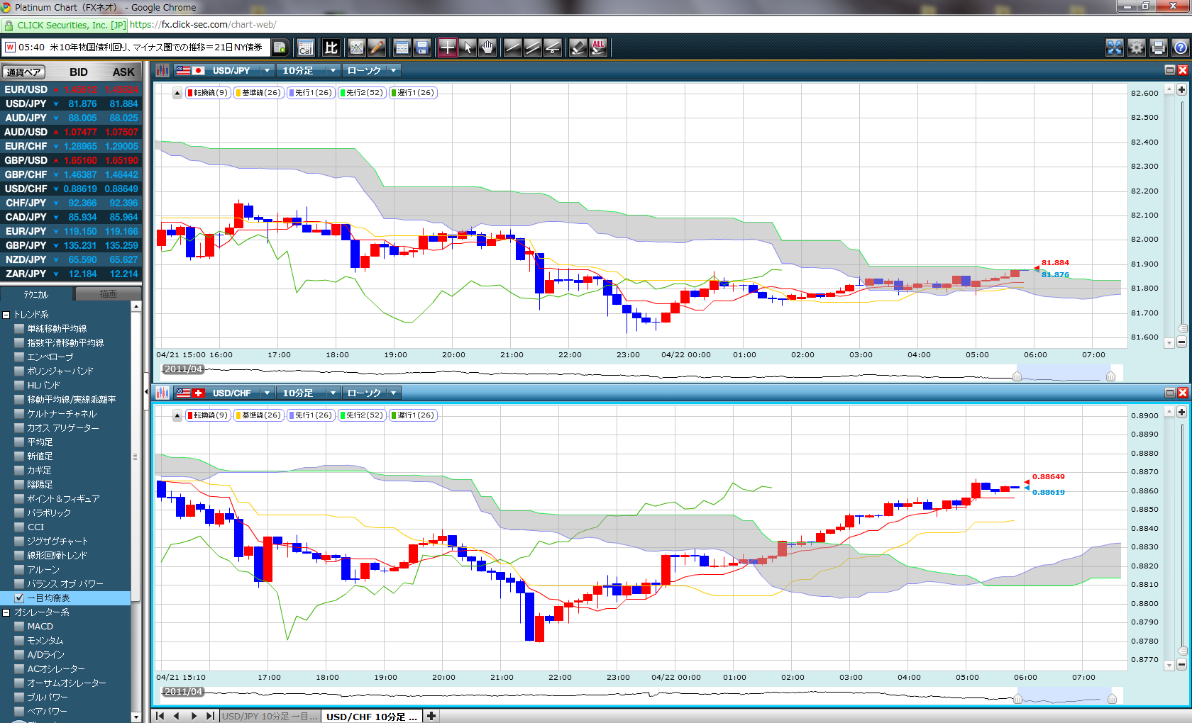 昨日の指標近辺からのチャートです、これはUSD/JPYとUSD/CHFを上下に並べたものなのですが、23:00を境にCHFとJPYの上昇度合いを見てみてください。通常だとCHFの方がより慎重に回復する場面なのですが、今回はCHFの方が圧倒的に回復しています。一時期100pipsを超えるショーターの財布に優しいUSD/CHFだったのですが、結局10pipsのマイナス程度で引けました。このチャートだけみると、USD/CHFは騰がる通貨にすら見えます。