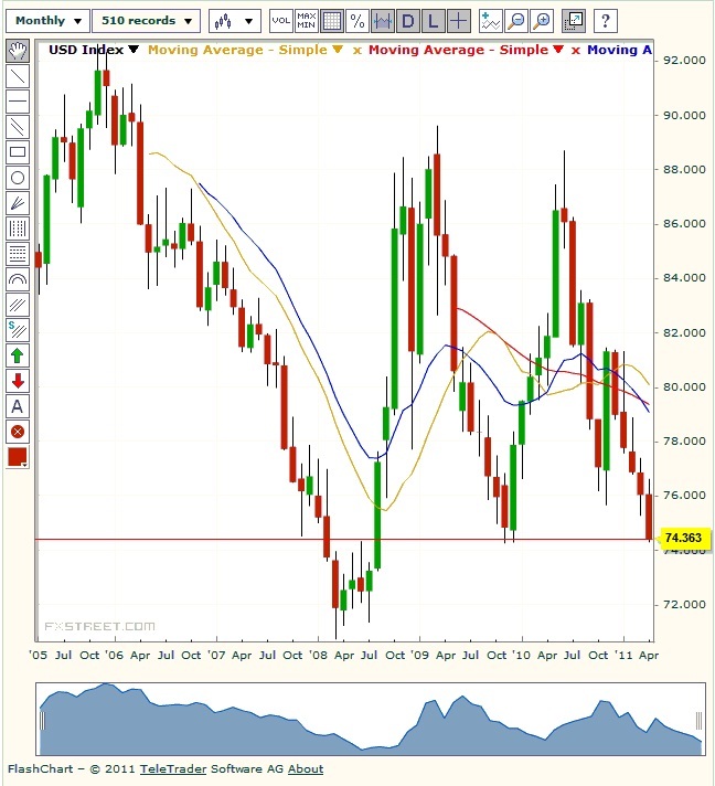 ドルインデックスのチャートをご覧下さい。現在はリーマンショック、ドバイショックでの底の次の底値圏にあります。ここで逆3尊となりそろそろ上昇するのではないかとも思えます。ここ数ヶ月の状況を見てもこれはセリクラという風にも見える動きです。