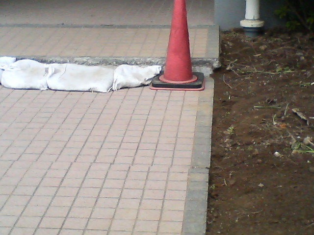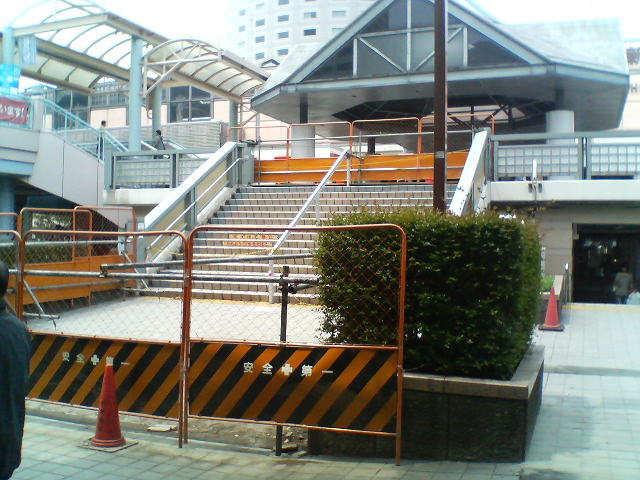 JR新浦安駅の正面の階段がまだ閉鎖されたままであったり,よく見ると凹凸が認められる歩道とか,あるアパートの入り口にできた10cmほどの段差。言うまでもなくこれらはほんの一端に過ぎない。広場,歩道の路面が水平あるいは垂直方向にずれたそこかしこに,応急措置としてアスファルトが入れられている。本来水平面であったはずの歩道にできた凹凸ばかりを見ていると,初めてだからかも知れないが平衡感覚が少しおかしくなるような奇妙な感覚を味わった。