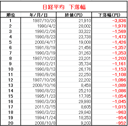 下落幅と下落率ランキングを調べてみました。