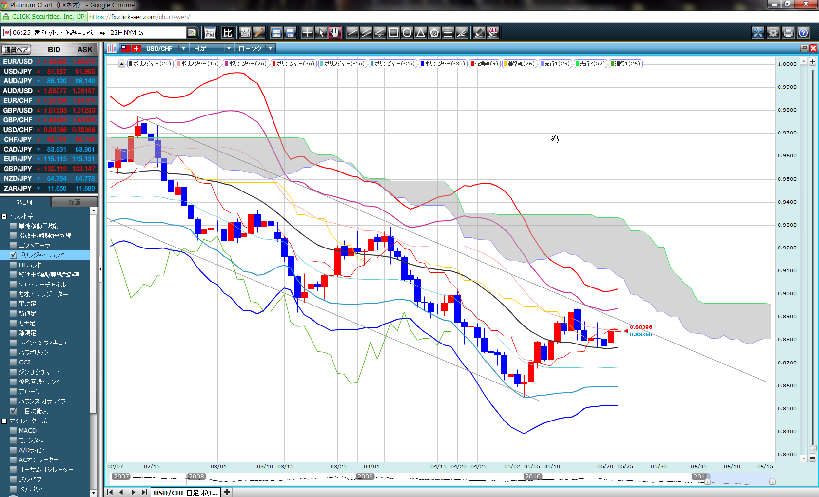 2011/05/24 - Micky G. Albertさんの株式ブログ。タイトル:「まだまだ下がるかEUR/USD、それとも・・・」 本文: 下がる下がると日記に書いていたEURですが、やっとらしい下げに。