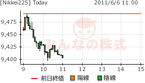 2011/06/06 - minnsann123さんの株式ブログ。タイトル:「6/6のメモ 9400円は想定内か」 本文:昨日の日記のコメント欄に個別のpics銘柄の今週の取り組みをまとめたが、NKの一旦下げを懸念しての損切り等についてであった。そういう意味では、今日の下げは想定内の動きなのだが、9400円を一時切る動き