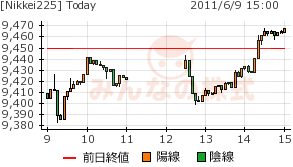2011/06/09 - minnsann123さんの株式ブログ。タイトル:「6/9のとりあえずのメモ」 本文:本日のNKは、再度下値を探っている。円高を受けて安値の攻防か。 NK 画像1  為替 ドルが79.85から80.3円まで急騰し、反落、戻しで80.1円。引け後にも上下して、80円の攻防に。