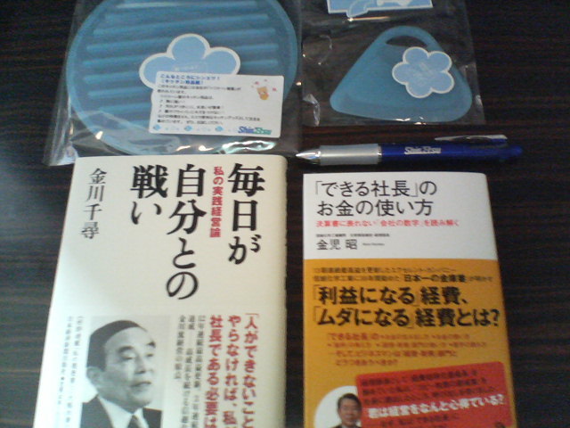 金川氏および同社顧問・金児昭(かねこあきら)氏の著書,同社製品の鍋敷きと(フライパンなどの汚れを落とす)ヘラ,ボールペン(グリップ部分の樹脂が同社製)。なお,もらったからうれしく,あるいは自慢しようなどと写真をアップしているわけではない,写真を添える方が具体性を帯びてベターだろうと思うからに他ならない。その辺りは誤解なきよう。