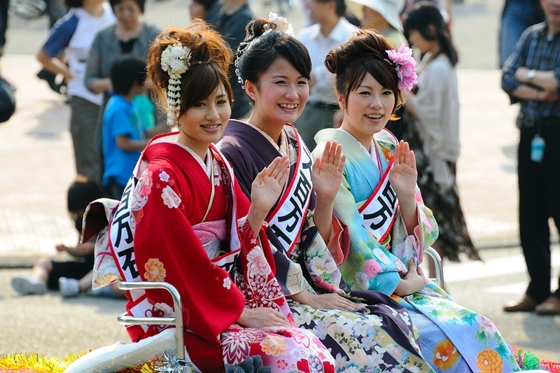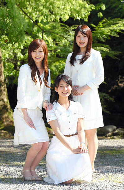 ミス百万石に選ばれた(左から)加藤さん、山下さん、浦さん 金沢百万石まつりを華やかに彩る2011ミス百万石が24日、発表された。34代ミ スに選ばれたのは、加藤綾美さん(22)=白山市=、山下沙織さん(23)、浦綾香さ ん(23)=いずれも金沢市=で、3人は「東日本大震災の被災地をはじめ、日本中に元 気を届けたい」と意欲を語った。