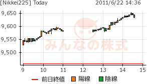 2011/06/22 - minnsann123さんの株式ブログ。タイトル:「6/22のメモ 2 高値更新、上放れか」 本文:過熱気味の一日となった。復興法案の可決と、ギリシャ国会で信任案可決、国会延長案見通し、などを好材料として、上げて寄りつき、その後も下げ圧力低く直近高値に迫り、保ち合いの上抜け期待が高まった。後場になっ