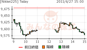 2011/06/27 - minnsann123さんの株式ブログ。タイトル:「6/27のメモ 体調不良でとりあえずのメモ」 本文:本日のNKは、後場にやや上げるも、結局9550円に迫り終値9575円に近づけた。日足は典型的な陰線となるが、高値圏での値付け。 NK 画像1