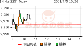 2011/07/05 - minnsann123さんの株式ブログ。タイトル:「7/5のメモ AM NK高値圏。ドル高で」 本文:本日の寄りつきは昨日のほぼ終値から、再度10000円を目指そうとするかのような上げ。9980円の憶測を上回って反落するも再度上値を目指す。 NK 画像1