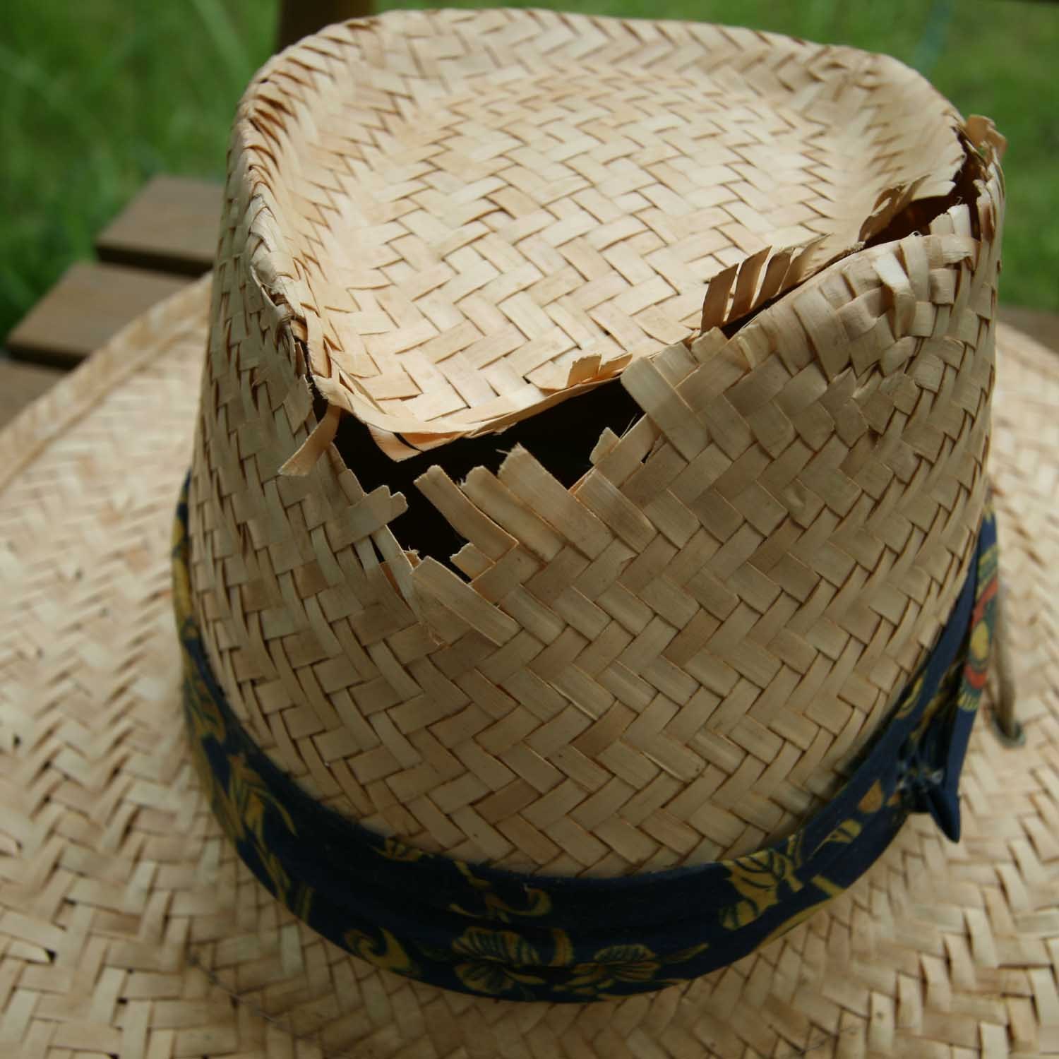 私が愛用していたガーデニング用の麦わら帽子は、傷みが激しく穴が開きました。(右の写真)
