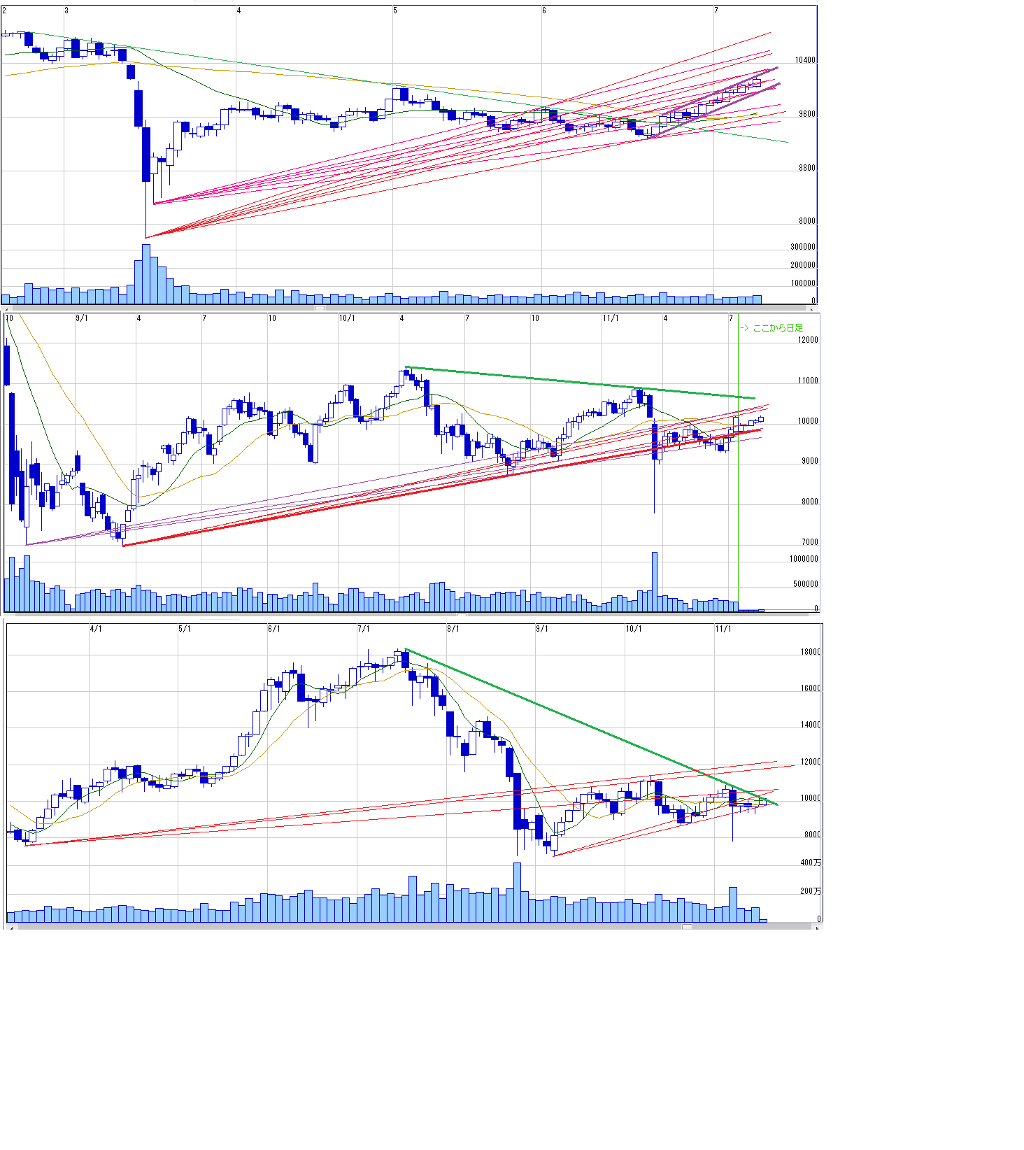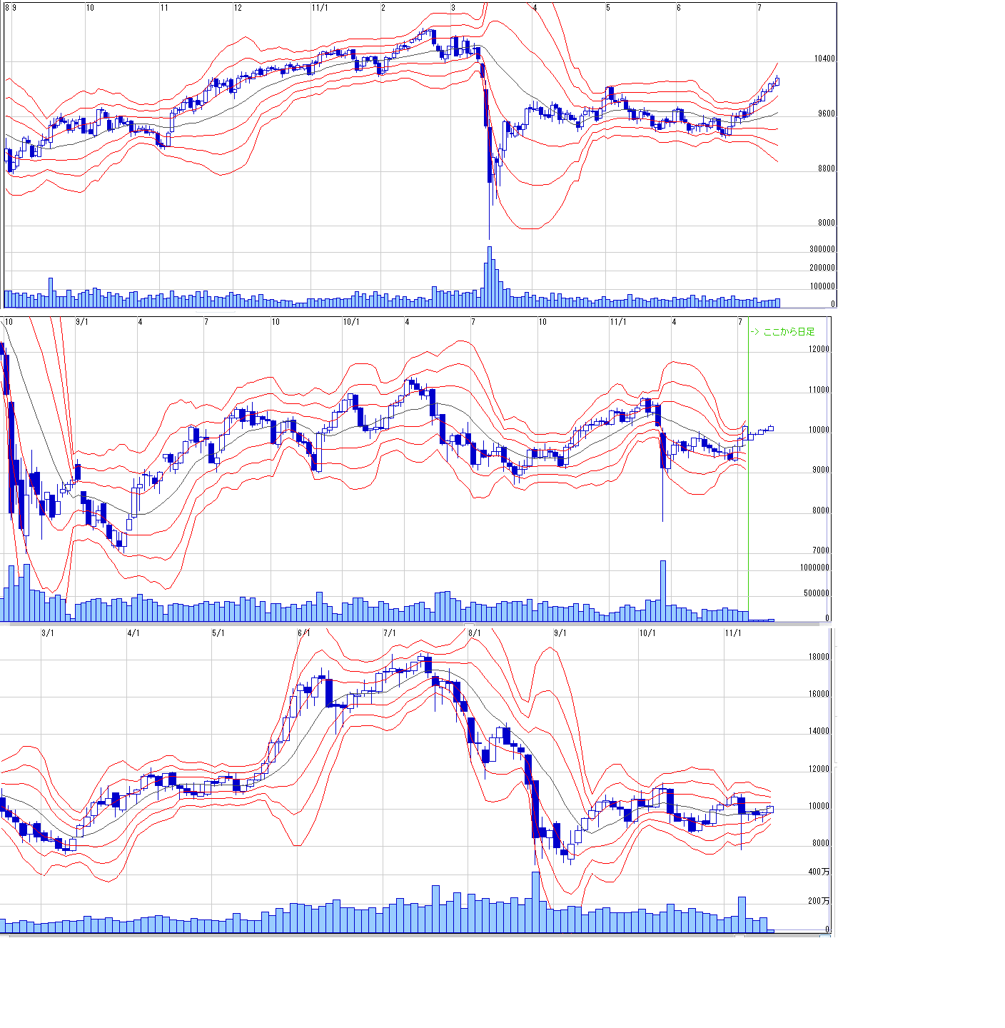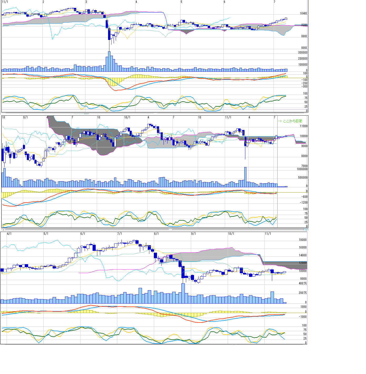 2011/07/10 - 月とスッポンさんの株式ブログ。タイトル:「7/11 来週のチャートポイント①」 本文:日経先物 N値=103303/11MD=10270現物安値 10255窓 10310-10330
