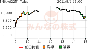 2011/08/01 - minnsann123さんの株式ブログ。タイトル:「8/1 後場は下げに転じ、震災後の動きと同じか。」 本文:NKの震災後の数日間の動きを一日で再現したかのよう。好材料で上げはしたものの、基本的な不安・懸念材料の解決はされていないので、上げ止まることは目に見えている。アメリカ国債の格付けは、先日より下げの時期