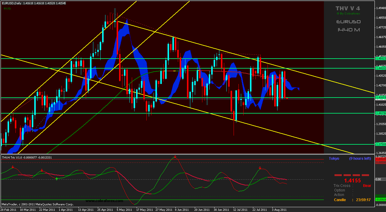 2011/08/11 - うおうおさんの株式ブログ。タイトル:「8/11朝 ユーロドル」 本文:ここ数日200pipsくらいのローソクが続いています。一昨日の上げた分を昨日ほぼ完全に戻しました。 そろそろ大きく動くかなぁ