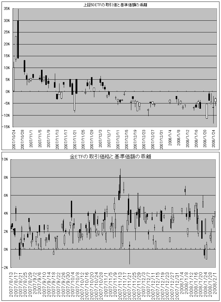2008/02/01 - miyakenさんの株式ブログ。タイトル:「金、上証50ETFの基準価額と取引値の乖離(08/01E)」 本文:基準価額と大証取引値(四本値)の乖離をグラフにしてみました。 プラスは取引値が当日の基準価額より高い、マイナスは取引値が基準価額より安い。