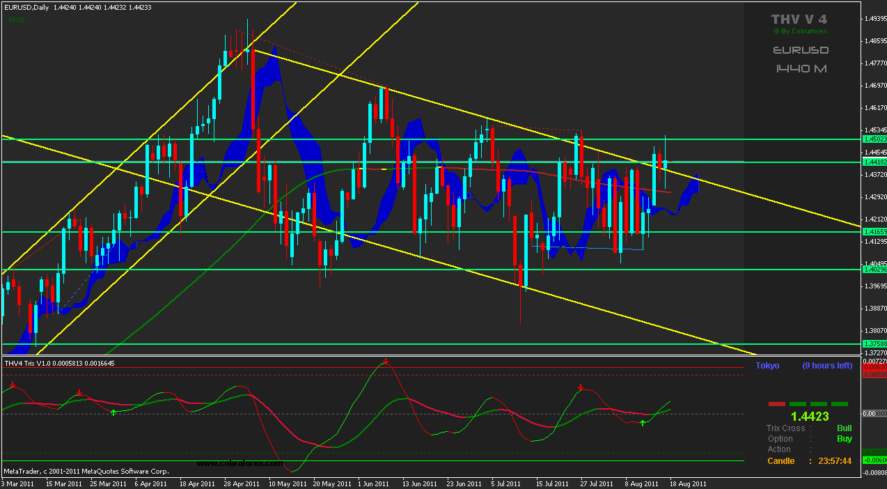 2011/08/18 - うおうおさんの株式ブログ。タイトル:「8/18朝 ユーロドル」 本文:昨日は1.45越えてきたので、本当にショート損切りしようかと思ったが放置。今見たら上下に長いヒゲが付いたローソクで、なんとも言えない。こういうとき テクニカル的にはどう動くのかなぁ・・・・