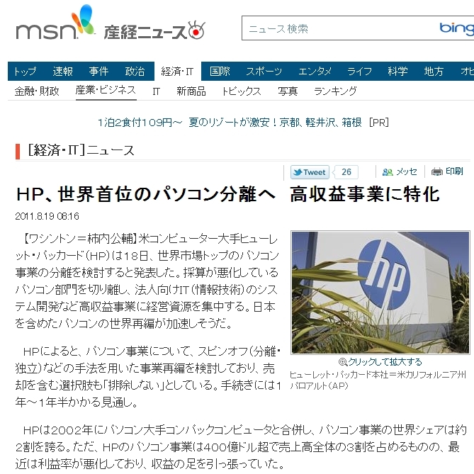 DELLが数年前にPC販売首位の座を hp に譲り渡したと思ったら、hp も儲からないということでPC事業を分離することになった