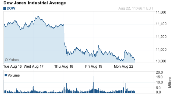 2011/08/23 - minnsann123さんの株式ブログ。タイトル:「8/22-23 ダウ下げ止まるか」 本文:NYダウ寄り付きは高かったが、その後下げている。このまま下げ続けるか、下げ止まるか。さしたる悪材料がこのまま出てこなければ、下げ止まると思われるが、小幅下げは避けられないかも。で、そうなると、NKは最