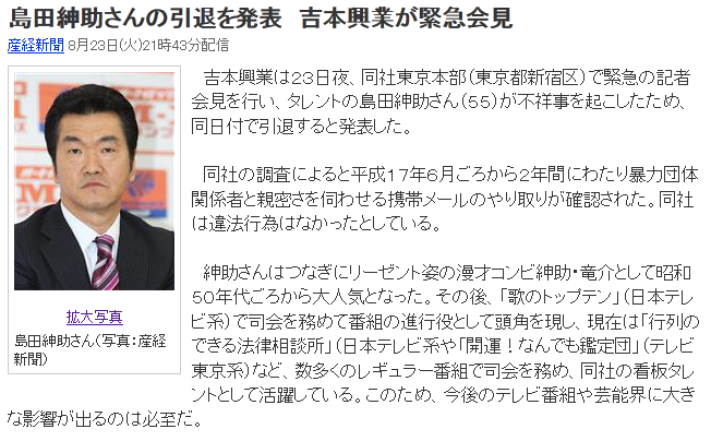 このたび、弊社所属のタレント・島田紳助について、平成23年8月23日をもって芸能活動を引退することとなりましたのでご報告申し上げます。