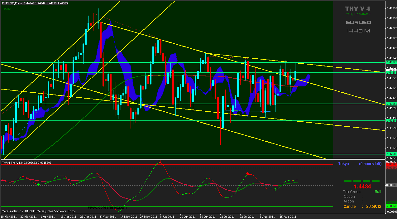 2011/08/24 - うおうおさんの株式ブログ。タイトル:「8/24朝 ユーロドル」 本文:ううむ最近あまり動いてないなぁ上に行きそうでやっぱりもどってくるし。 またショート追加しました。まあ今回は損切り幅小さいので損切りしても700円くらいですがw0.1枚取引は気楽でいい