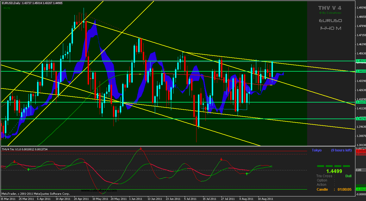 2011/08/29 - うおうおさんの株式ブログ。タイトル:「8/29朝 ユーロドル」 本文:金曜日は上昇してますね。トレンドライン超えてきそうですが、なんとなく一気に抜けるのでなく緩やかに上昇していく気がします。まだロングする時じゃないと思っています。(まあ私の判断はいつも裏目に出ますがw)