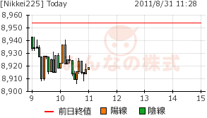 日足チャートでは、8900円割れもありうるところだが、8890円あたりで止まれば、上昇トレンドは継続と見たい。それ以下に下がれば、やはり一時的な上げだったことになろう。
