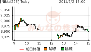 2011/09/03 - minnsann123さんの株式ブログ。タイトル:「9/2-3 ダウ下げ、円変わらず」 本文:ついにダウが下げた。予想より悪い指数が出たことと、欧州の続落が原因らしい。昨夜記録しなかったNKは日足はほぼ十字線。 画像1