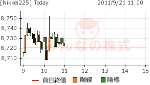 2011/09/21 - minnsann123さんの株式ブログ。タイトル:「9/21 調整の日かと思ったら為替激動」 本文:寄り付きは下げていたが、すぐに上げて、上下めまぐるしい展開。NKが平均なのにこの上下は、個別の銘柄による偏りのためらしい。と書いて、為替を見るとびっくり。NK 画像1 為替