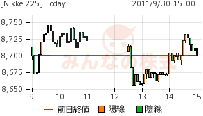 2011/09/30 - minnsann123さんの株式ブログ。タイトル:「9/30 為替レートと連動したかのようなNK」 本文:為替レートは、午前9時に、ドル76.7円とユーロ104円の目安を切り下げている。切り上げれば株価の上げと憶測していたのにその真逆の動きだったことになる。その結果かどうかは分からないが、NKは昨日の終値