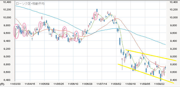 もし、以上の憶測が正しければ、来週の株価は8800~8400と見ることが出来る。ここでの8800円は、25日移動線が来週は上昇するからであり、この抵抗線はまだ継続するという意味。また、8400円は直近安値近辺という意味であり、もしこの直近安値を更新するようなことがあれば、昨日の大陽線はダマシと見ても良いと考えるが、どうだろうか・・・。8400円を下回ることは考えたくないが、あるとすれば、10月半ばまでで、その後は上昇トレンド形成に向かうものと期待したい。