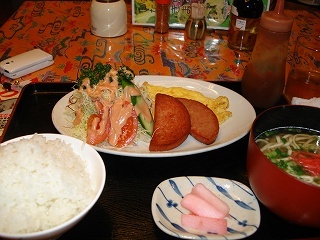 PHOTO-沖縄の定食 缶詰の肉焼いたもの+卵焼き 600円