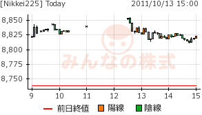 2011/10/13 - minnsann123さんの株式ブログ。タイトル:「10/13 日足は十字線。高値8850円止まり。」 本文:憶測どおり上げたのだが、やはり、円高に向かう流れが生じて、NKは上値が重くなり、反落し安値を確認して戻したところで終了。日足は迷いの同値になったようだ。 NK 画像1