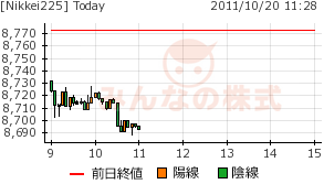 2011/10/20 - minnsann123さんの株式ブログ。タイトル:「10/20 NKは一段の下げで、8700円切り。」 本文:日足チャートでは、25日移動線が底値圏を示唆しており、持ち直す可能性を見せている。当面は8650円あたりが底値となるかが注目点。 NK 画像1
