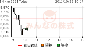 2011/10/25 - minnsann123さんの株式ブログ。タイトル:「10/25 NK高値で寄りつく」 本文:その後下げて、憶測どおり昨日の終値を切り下げた。 NK 画像1 安値が8800円止まりとなっているのは、海外市場が上げたことと、利益確定売りが一巡したということなのか。